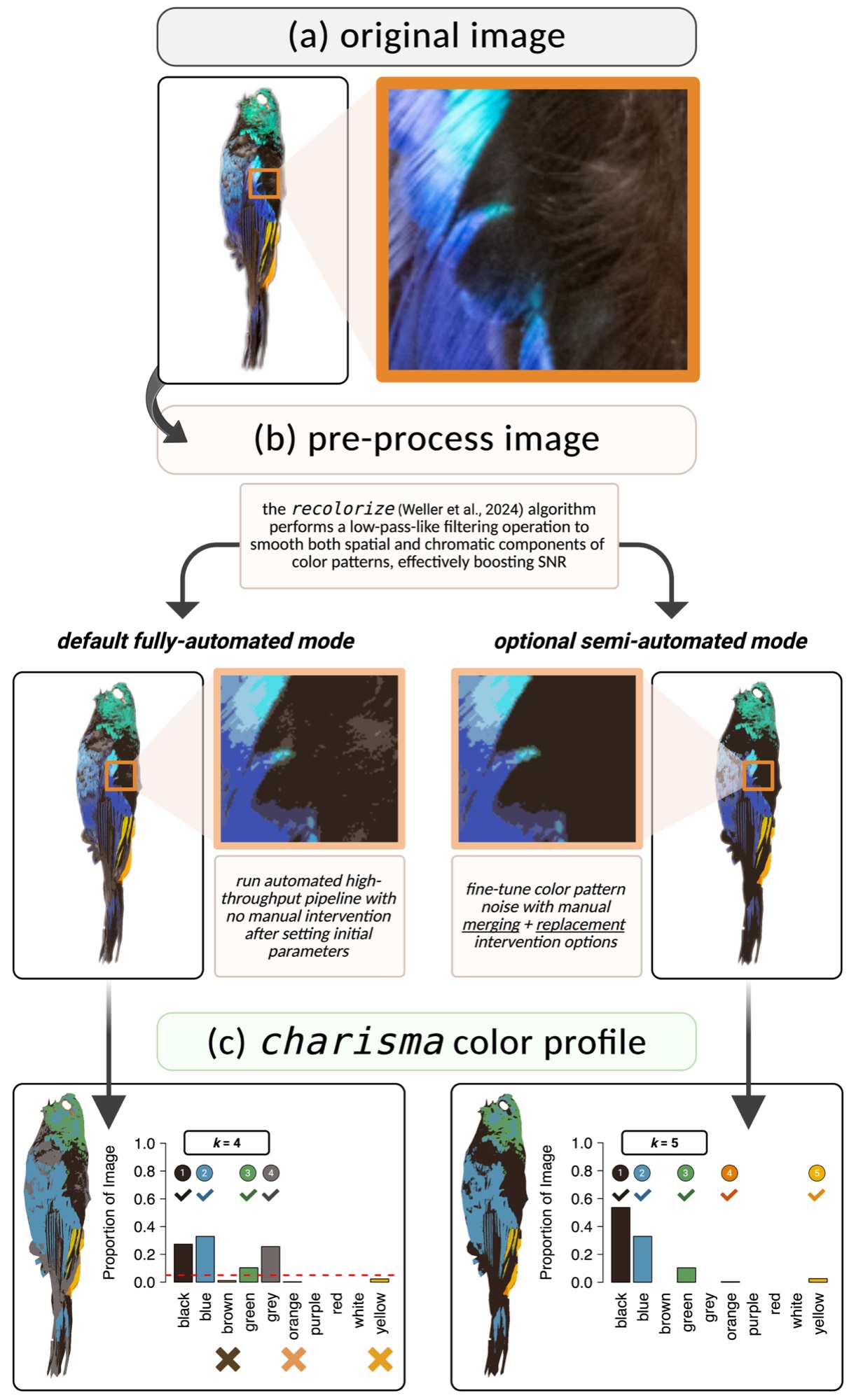 Schwartz, S.T., Tsai, W.L.E., Karan, E.A., Juhn, M.S., Shultz, A.J., McCormack, J.E., Smith, T.B., and Alfaro, M.E. (2025). charisma: An R package to perform reproducible color characterization of digital images for biological studies. (In Review).